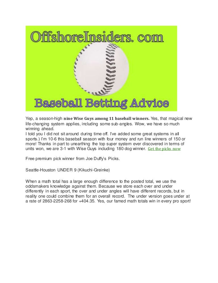 It is literally the oldest broadcast on sports betting. http://offshoreinsiders.com has a free winning pick for Monday's betting. Joe Duffy's Entire card at 7:10 ET or later and does NOT include Marlins or Phillies games The Grandmaster has four winners for Monday, with three of them underdogs. Solid 15-12 but this is with mostly underdogs or runlines in which we get back the juice. Thus, five winners of +130 or more, including four Juicy Lucys. Previously referred as a Dandy Dog, a Juicy Lucy is either a moneyline underdog or runline favorite in which we get at least +140 juice. We changed the name to reflect it includes runline chalk. Get the picks now